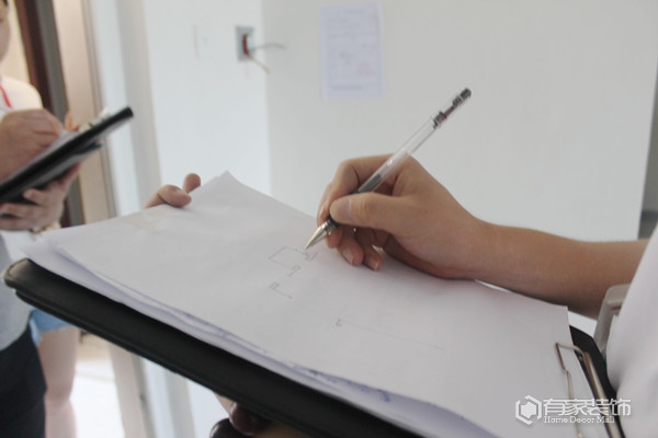 等啊等,等啊等,等啊等......终于是等到了交房的日子。精心打扮了一番之后,我也是来到了交房现场。因为在交房前就确认了装修交给有家装饰,所以事先约了工长过来验房。一切都没有问题后,就填表提交给开发商。为什么找有家装饰?额,这也是缘分啊!身边的同事,在这个品牌做过装修,质量非常的不错,我算是慕名而来选择的该公司。另一方面,在我来到这家公司的第二天,我爸妈也是打电话给我推荐了有家装饰。后面呢,双方深入沟通过后,我也是参观了他们的材料展厅、工艺间及十来套在建工地,发现有家装饰确实挺好的,果断是提前签约(下定)了。验房结束后,一同来现场的设计师吴路瑶和他的团队,也是全方面帮我家量了一次房。
