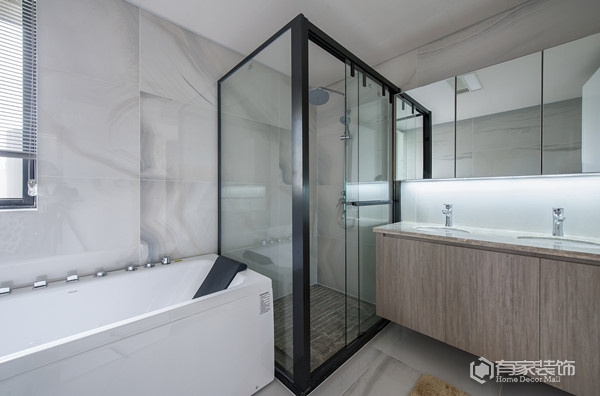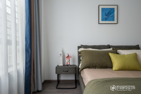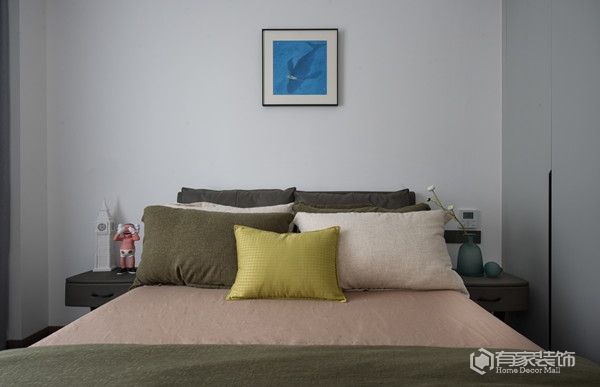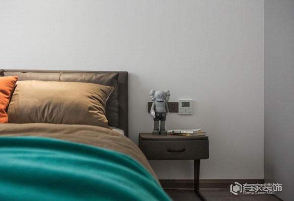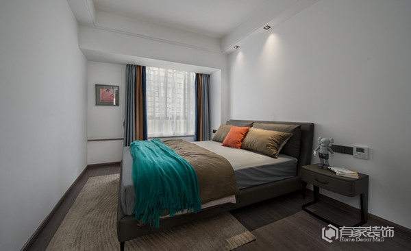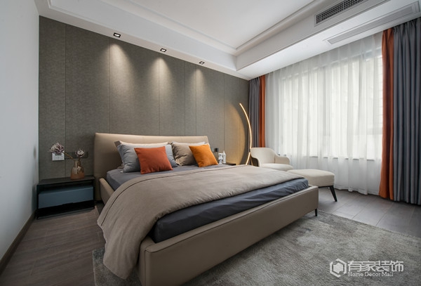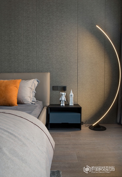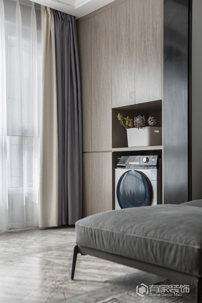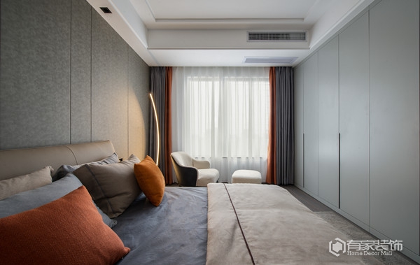 封顶式的主卧衣柜设计,通体灰色调,简洁大方。以灰白为主色调的主卧,营造出一种宁静祥和的休憩氛围。