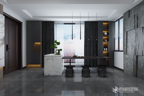 “茶香绿韵 品茗乐道”。该区域的设计,集休闲与品位的地带,彰显屋主的待客之礼,在生活节奏繁忙的季节,这里有茶、也有故事。