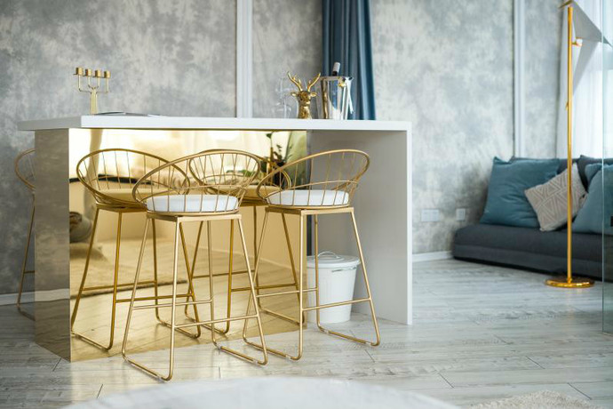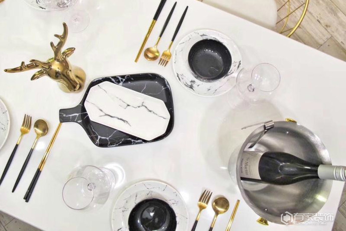 金属是一个很好的元素来体现轻奢时尚的概念,由于我家空间硬装颜色比较素,就需要用具有色彩的软装来提亮空间,金属能很好的起到这个作用,又能在深沉的搭配中平衡这种时尚感。其中设计师做了吧台设计,颜值很强大有没有?即使不使用,摆拍一下也是很赞的。平时我和家人或者朋友主要提用来喝酒、聊天、用餐。