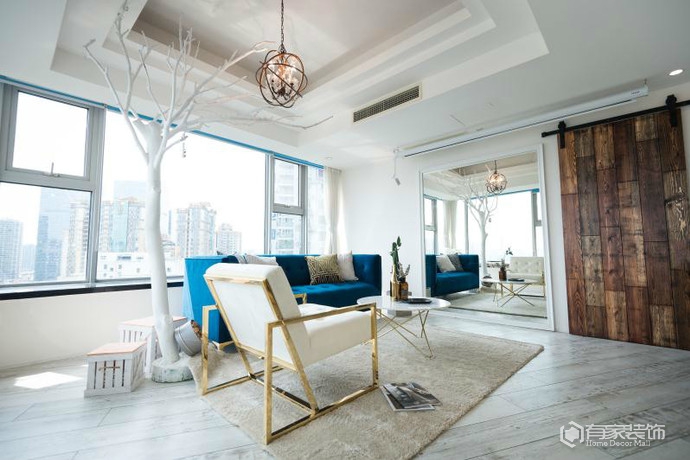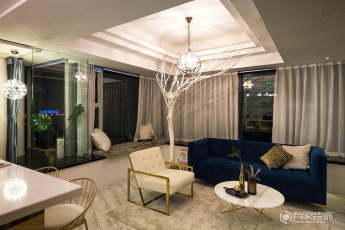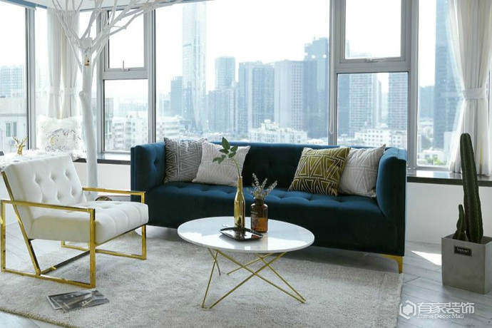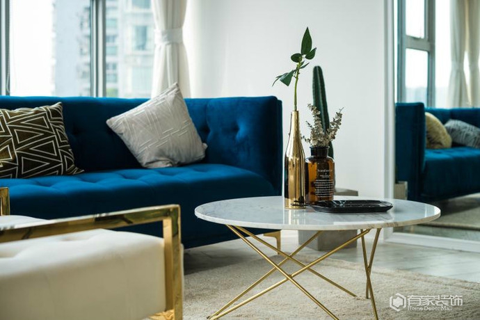 我家整个客厅色彩的点睛之笔就是宝蓝色的沙发,宝蓝色既沉稳又具有活力,给人的色彩冲击力也比较强,所以是不二之选,再配上当下比较流行的金色不锈钢元素,整个效果就出来了,时髦耐看又上镜。设计师去处多余的绿植去装饰空间,因为空间有限加上打理不到位,所以只是稍微的点缀就好。