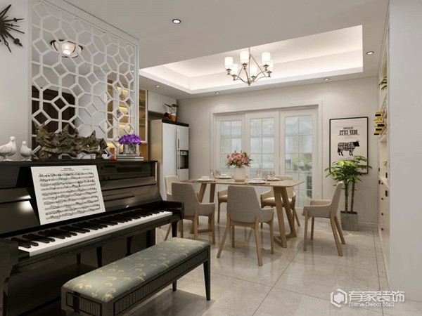 在设计的过程中,设计师蔡明老师大量使用了原木色与白色作为主体色。同时,在恰当的位置放了深色调的家具,以达到空间的平衡,使空间的尺度感得到提升,而又不失内涵。餐厅布局营造朴素、自然气息,散发出温馨的氛围。