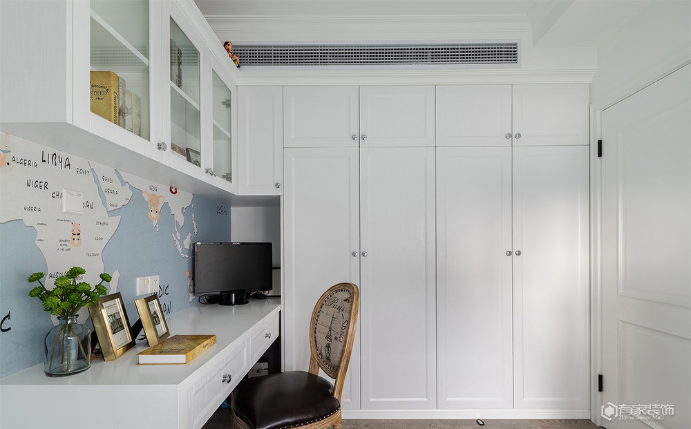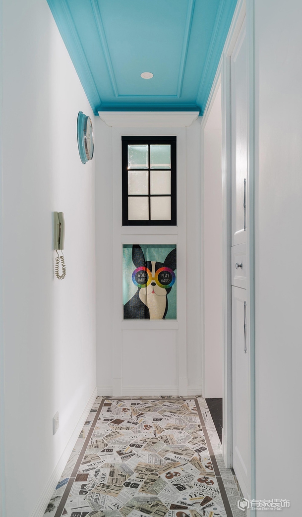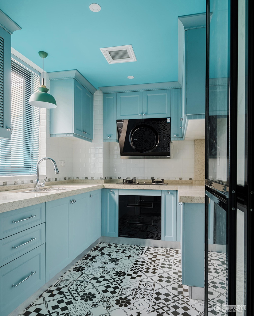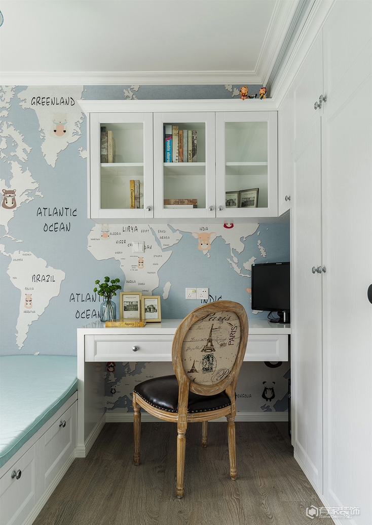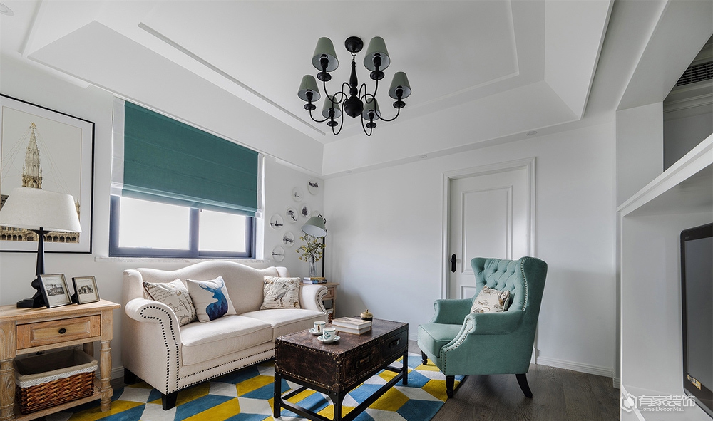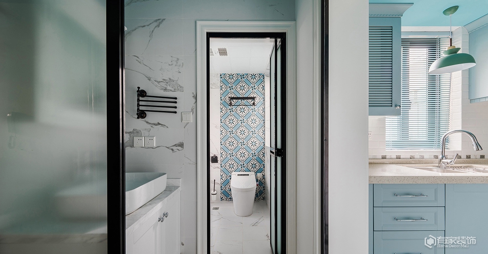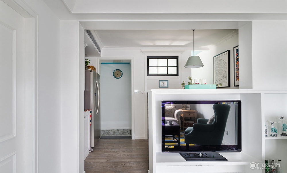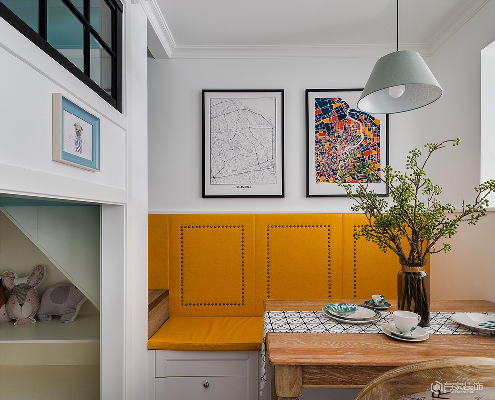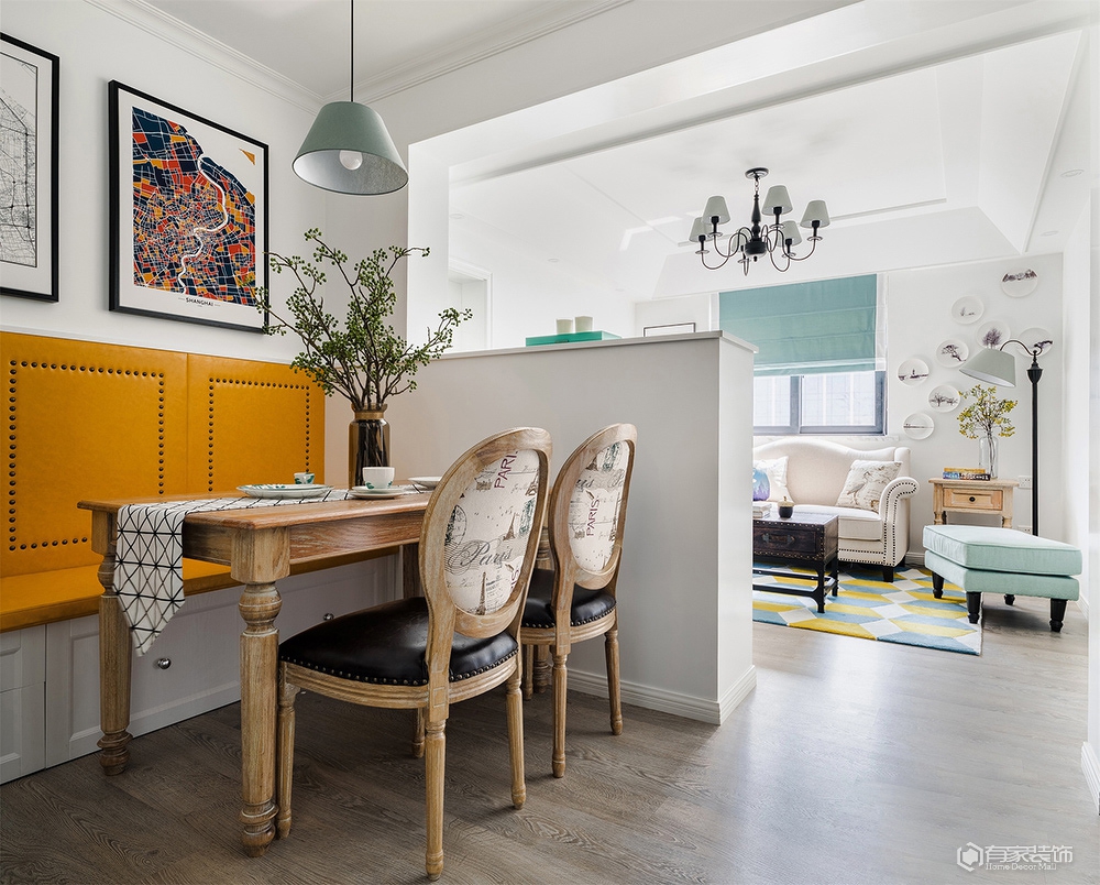 除了上述提及的儿童房。餐厅改造外,餐厅与客厅的衔接部分设计师用了一个半玄关的设计思路,正面看是餐厅卡座转角背墙,而反面则成为了客厅区域电视背景墙。我是从事服装陈列工作,本身对美感和颜色的要求比较高,在第一次与设计师碰面的时候就确定了美式装修风格,然而我又要求在传统美式中增强色彩搭配,这可差点把设计师难倒了,多亏他专业,选用了有贵族风范的爱马仕橙色、地中海风情的蓝色及清新脱俗的薄荷绿,巧妙融合,呈现恬淡质感的家。
