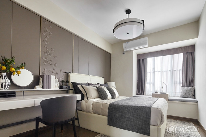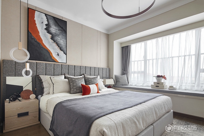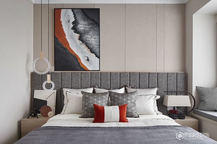 我有提到的颜色设计师都采用在方案里面,米白色、灰色、朦胧橙这些色彩在卧室中“不期而遇”,深灰色床头与素白色的丝光床品,极富质感的搭配,使空间多了一份理性的冷静。墙上的挂画为空间增添了趣味,没有多余的花样与纹饰,极富现代感的气息扑面而来。