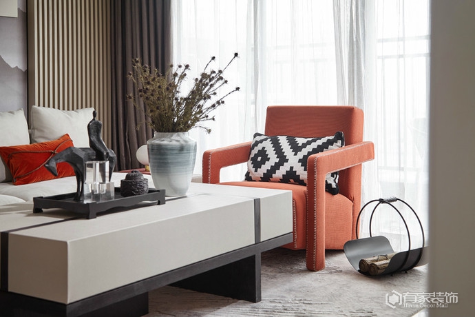 现在我介绍一下我的新家吧!整体色调由素雅的原木色与活泼的朦胧橙在空间中相互融合,一半静谧,一半绚烂,动静自如。大厅以棕色和素白色为主色调,朦胧橙的椅子打破了这之间的沉静,柔和的阳光透过窗纱散落在屋内,茶几上的青铜像,每一处都呈现出闲适自如的生活气息。