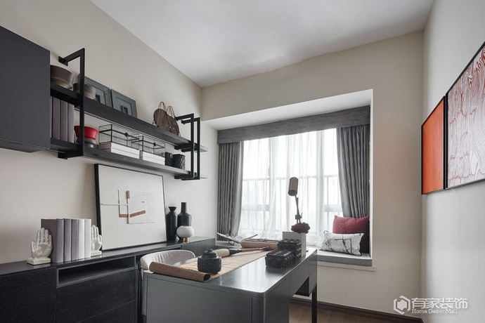 另外书房以黑色为主色调,沉稳内敛,橙色的挂画在空间中起到了点缀的作用,细微处更见品质,充满着一股潇洒风雅的书卷气。祝文婷设计师这套设计方案我打满分,在这个生活快节奏的时代,能给予我一处闲适自如的生活居所,这便是家。在这个家的任意角落里,都能感受到生活的美好。