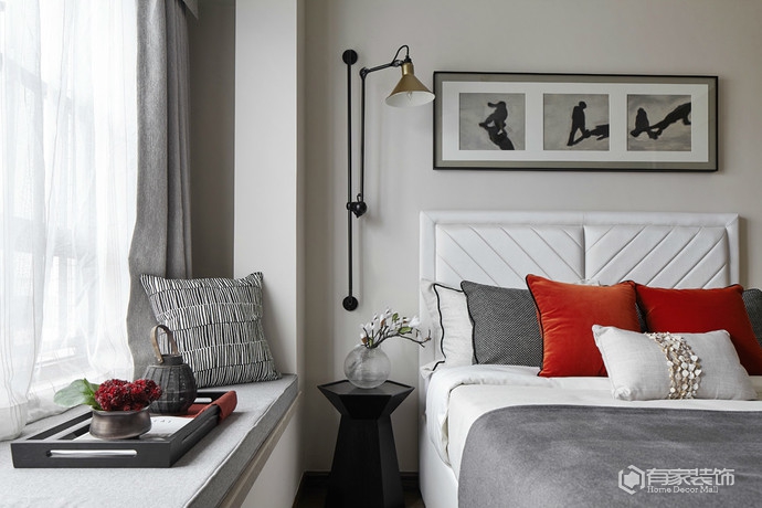 祝文婷设计师以白色作为卧室的基本色调,搭配以灰色和朦胧橙的床品,和谐辉映,轻与重之间没有繁复也没有冲突,整个空间给我感觉舒适而自然。