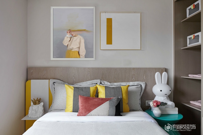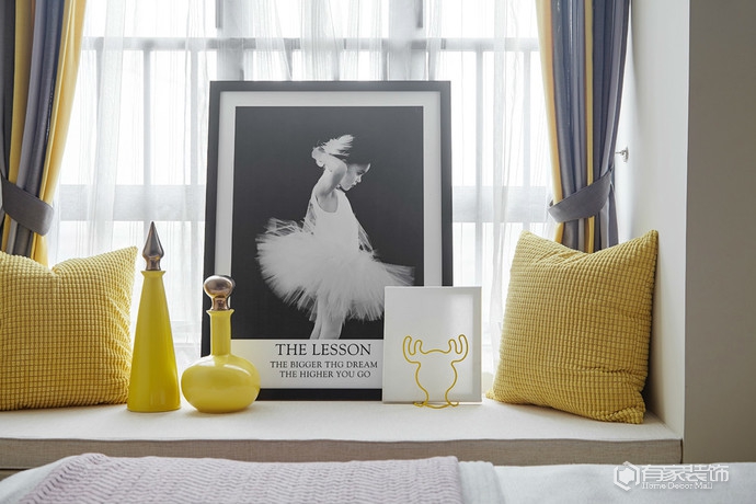 我和老婆育有一女,在儿童房的空间中白色是主要的基调,姜黄色的床品在室内作点缀。我希望孩子的世界总是丰富多彩的,设计师用了不少儿童摆件,和一幅穿芭蕾裙的女孩的挂画,呈现出童真和极富艺术气质的空间。