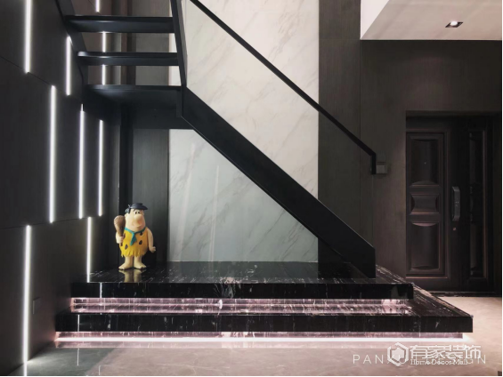 楼梯采用轻奢铁质踏步梯设计,加入规则形状的扶手,楼梯下布置休闲椅与画架,设计得更加艺术而优雅。规则直线的黑色扶手。还有一个富有趣味的人偶卡通摆饰,布置在楼梯下方,在铁质楼梯踏步的空间感下,显得优雅而小资华丽。