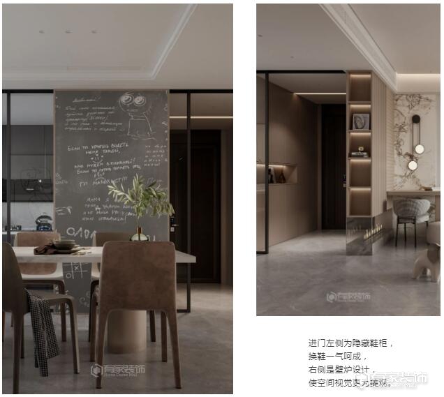 有家设计师考虑到屋主有两只宠物猫,因而为了猫咪安全,不让它们跑出家门,便在玄关加设自动门,使屋主收获安心与便捷。进门左侧为隐藏鞋柜,换鞋一气呵成,右侧是壁炉设计,使空间视觉更为美观。